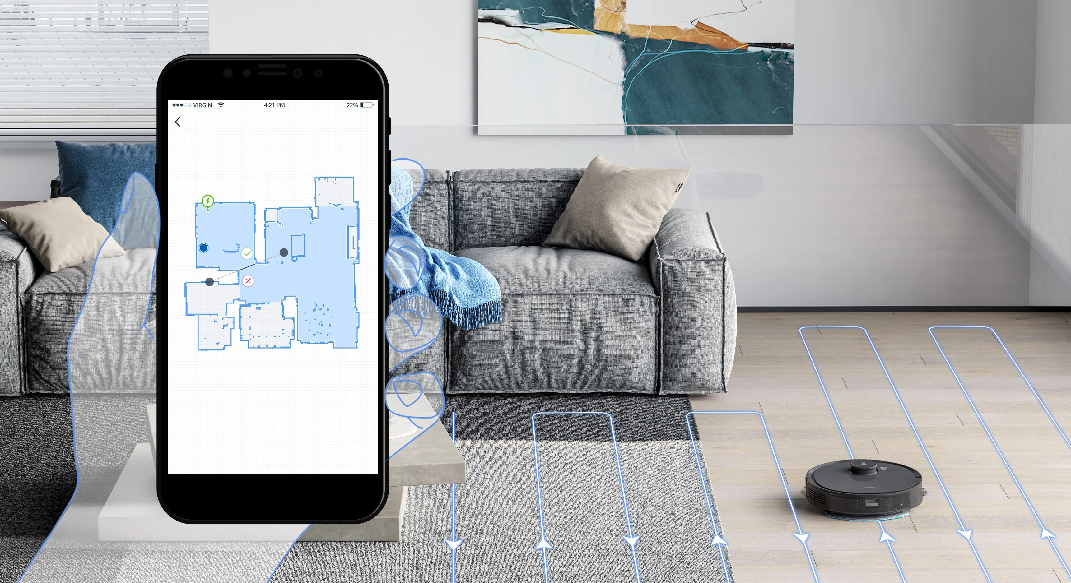 Mantenha a sua privacidade e satisfaça as suas necessidades de limpeza definindo limites virtuais em sua casa. Com a aplicação ECOVACS HOME pode criar limites virtuais para evitar que o robô entre em certas áreas.