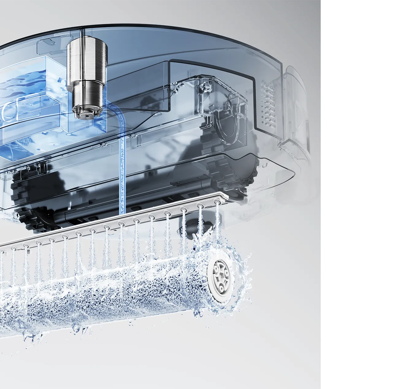 Dual squeegees on both the station tray and the robot scrape and wash at high speed, removing wastewater and stains.
