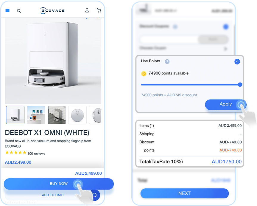 ECOVACS points are the points currency of ECOVACS Club that can be used to pay for your purchases from the ECOVACS Official Webshop.