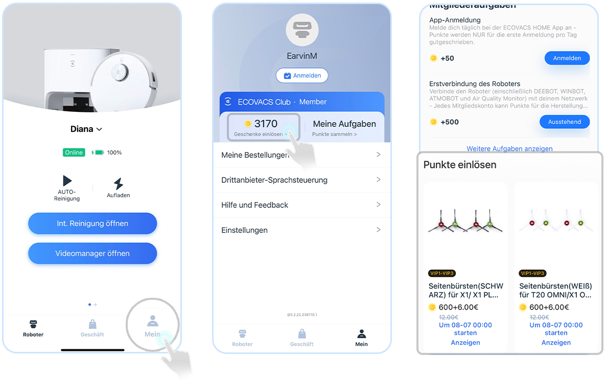 Siehe meine PunkteA:Ja, Sie können Ihre Punkte auch ohne ECOVACS-Clubmitgliedschaft einlösen, aber das müssen Sie wissen: