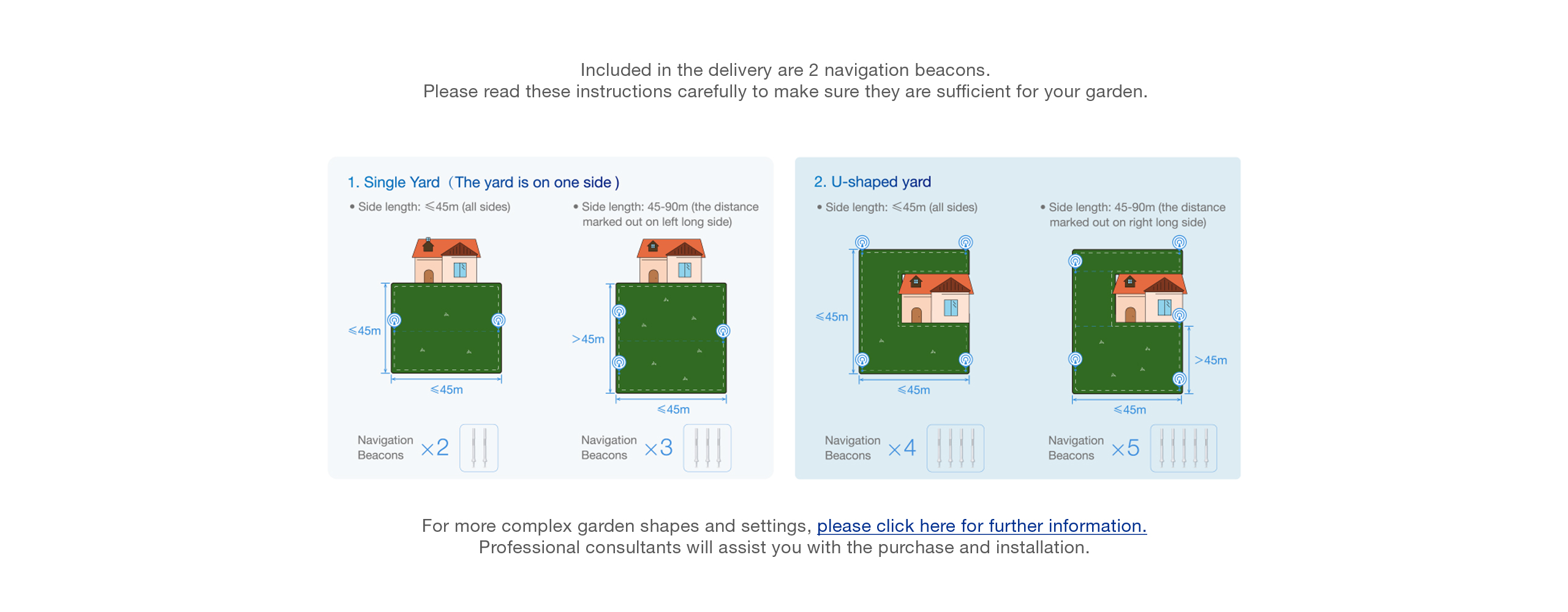 Manuel grænsesætning er ikke længere nødvendig med GOAT G1's trådfri afgrænsning. Fysiske trådgrænser erstattes med beaconsignaler, så alle grænser kan indstilles med ét klik via appen. Du får en ubesværet og tidsbesparende opsætningsoplevelse.