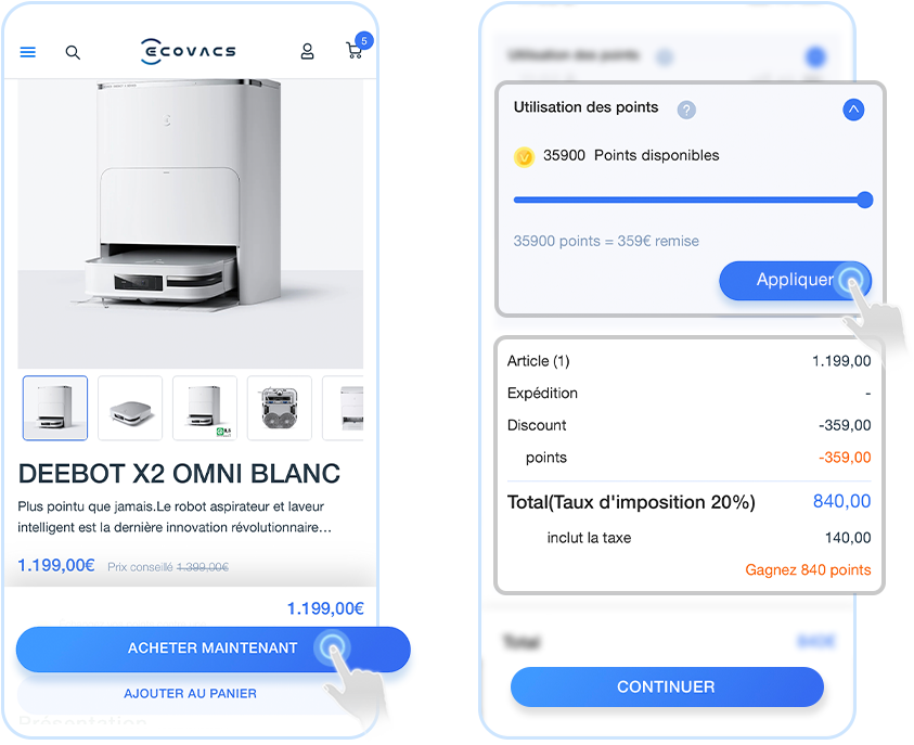Les points ECOVACS sont un avantage du Club ECOVACS qui peut être utilisé pour payer vos achats dans la boutique en ligne officielle d'ECOVACS.