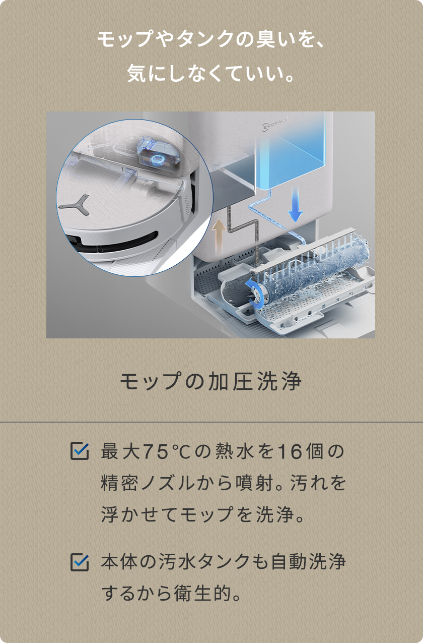 革新的なOZMO ローラー定圧式常時洗浄モップシステム搭載、まったく新しいロボット掃除機