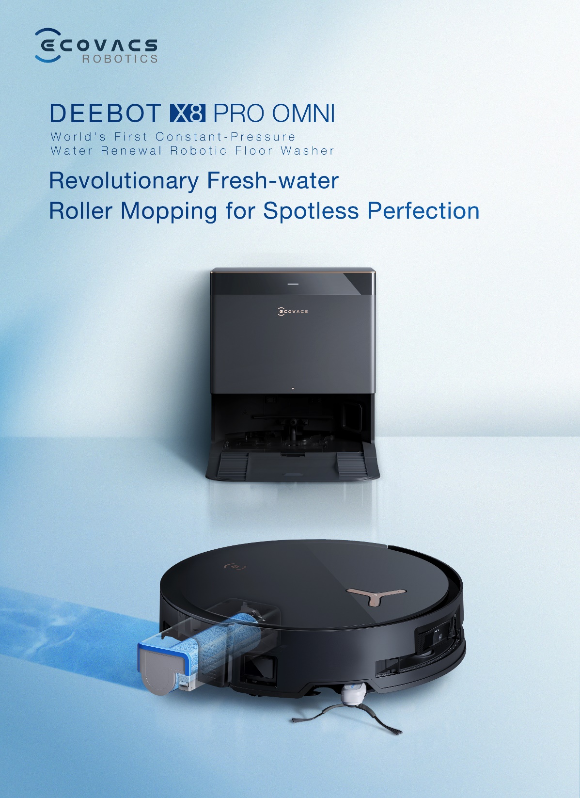 Rodzina DEEBOT X8 wykorzystuje opatentowany przez ECOVACS system OZMO ROLLER Water Renewal Mopping System, zaadaptowany z kluczowej technologii czyszczenia marki TINECO. Dzięki konstrukcji opartej na rolce technologia ta generuje większy nacisk — do ok. 4000 Pa. Pracując z prędkością 200 obrotów na minutę w trybie standardowym oraz z mocą ssania 13 000 Pa, DEEBOT X8 PRO OMNI skutecznie usuwa nawet najbardziej uporczywe zabrudzenia. System Water Renewal gwarantuje stałe samooczyszczanie mopa, zapobiegając wtórnemu zabrudzeniu i utrzymując wysoką jakość czyszczenia.